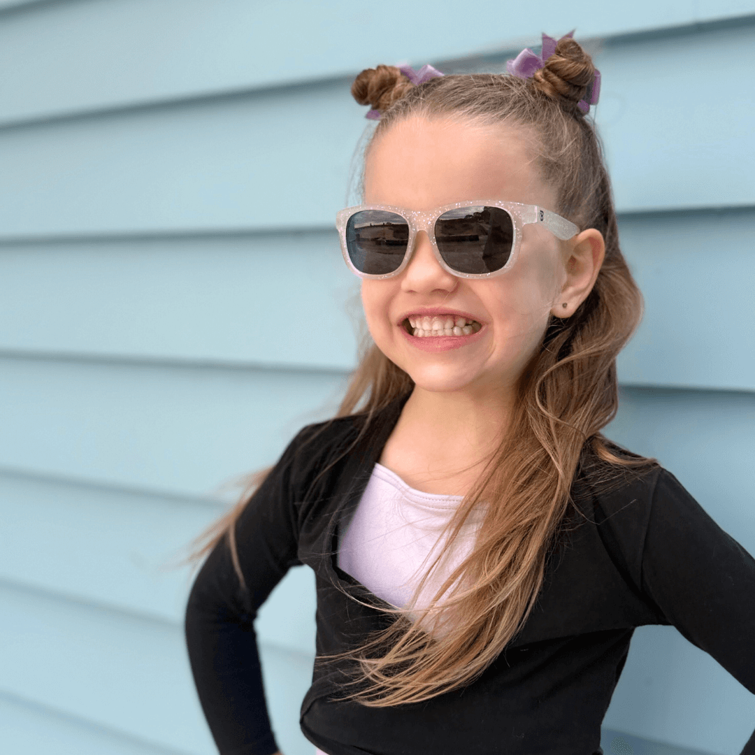 Shiny, sparkly, and full of fun! Our Silver Shimmer sunglasses bring a little magic to every sunny adventure. With sparkly frames that catch the light from every angle, these shades make playgrounds, park days, and ice cream runs extra dazzling.